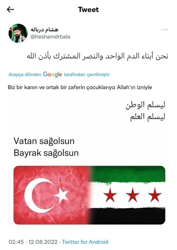 Askeri Şurta Komutanı Hişam Dırbele ise, "Biz bir kanın ve ortak bir zaferin çocuklarıyız Allah'ın izniyle" şeklinde sosyal medya hesabından Türk ve Suriye Bayrakları olan fotoğraf karesini paylaştı.