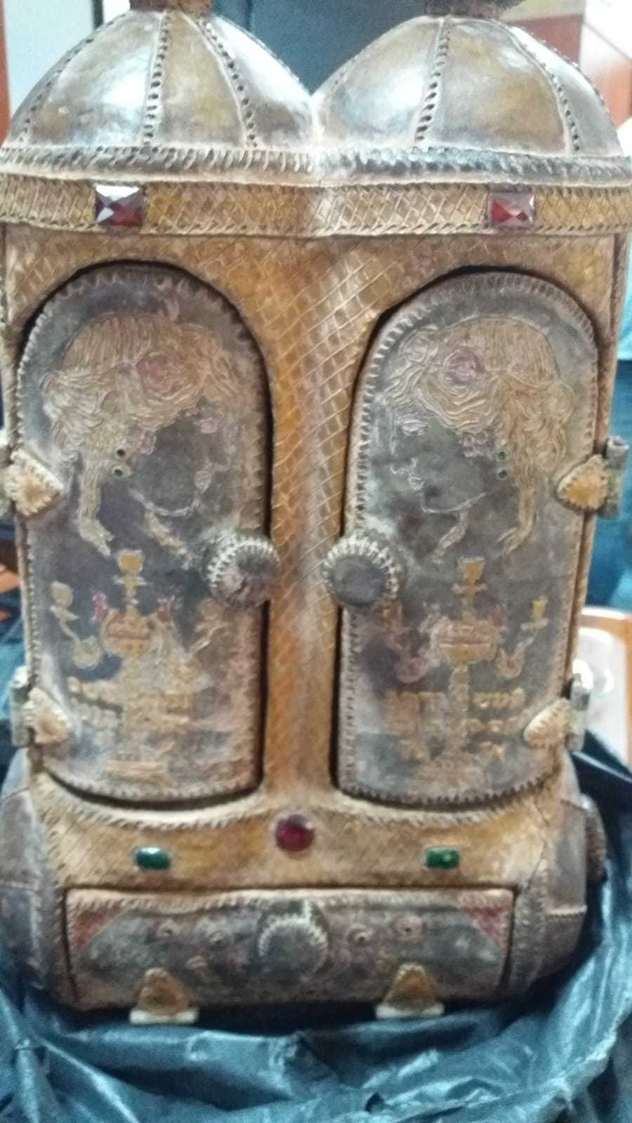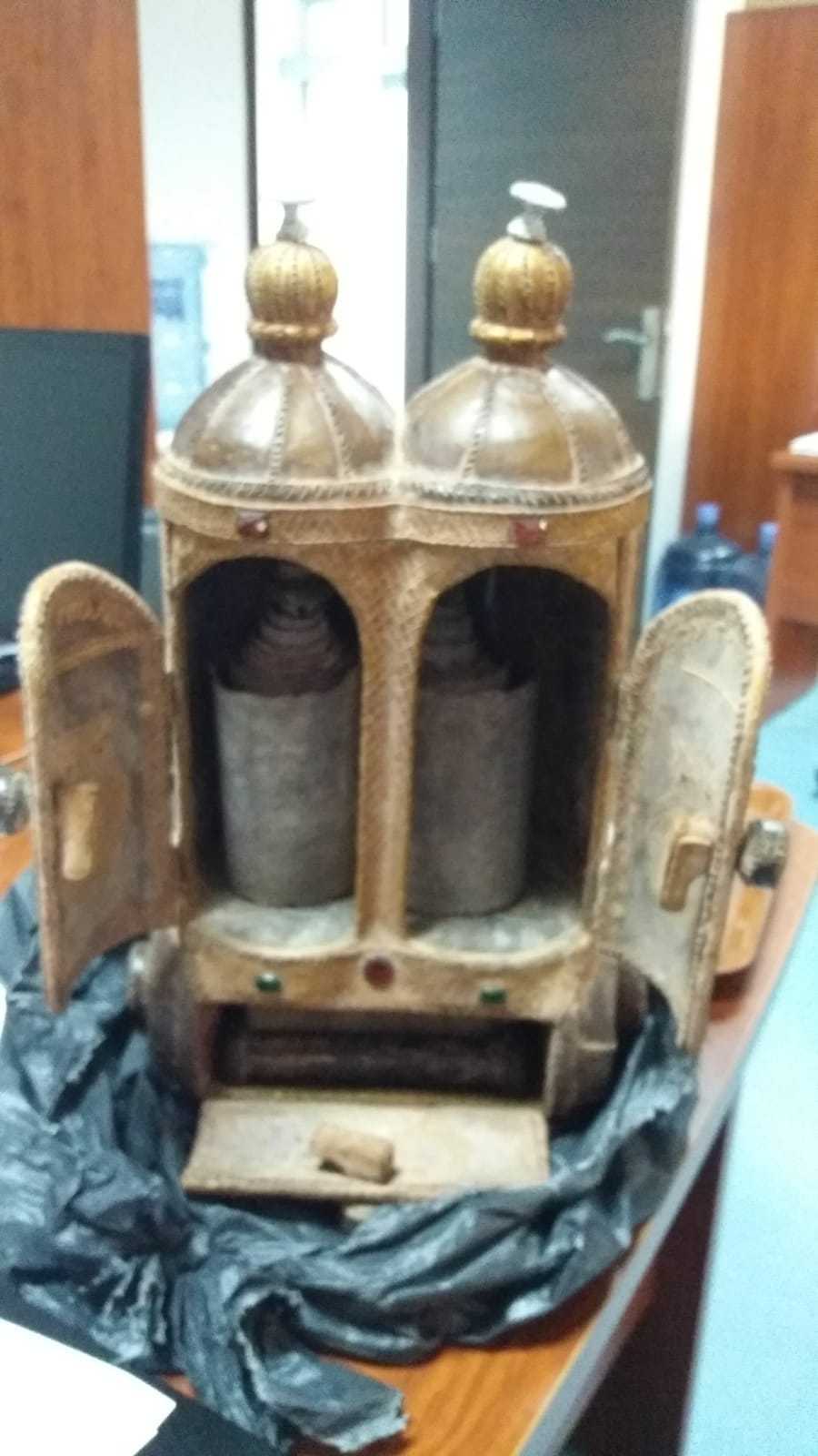 Sandukanın içinden İbranice yazıların olduğu ceylan derisi, alt ve üst çekmecelerinde ise Hz. Fatıma’nın eli sembolü ‘Hamsa’ ve Hz. Davut’un yıldızı diye bilinen figürlerden oluşan deri rulo çıktı.