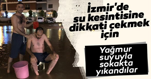 İzmir'de 2 arkadaş, sağanağın ardından oluşan su birikintisiyle yıkanarak kentte yaşanan su kesintisine dikkati çekmeye çalıştı. Kentte pazar günü başlayan ve 60 saat süreceği belirtilen su kesintisi nedeniyle çok sayıda vatandaş bidonlarla tankerlerden su almak için sıra bekledi.