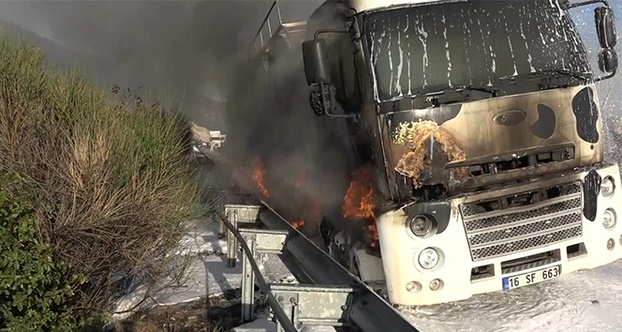 Bursa-Ankara otoyolunda süt tankeri alev alev yandı. Alevler yol kenarındaki ağaçlık alana da sıçradı. Yanan tanker ve ağaçlık alan itfaiyenin müdahalesi ile kısa sürede söndürüldü.