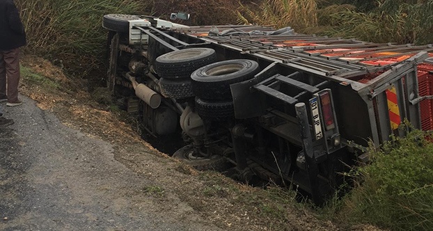 Mersin’in Tarsus ilçesinde yoldan çıkan kamyon devrildi.