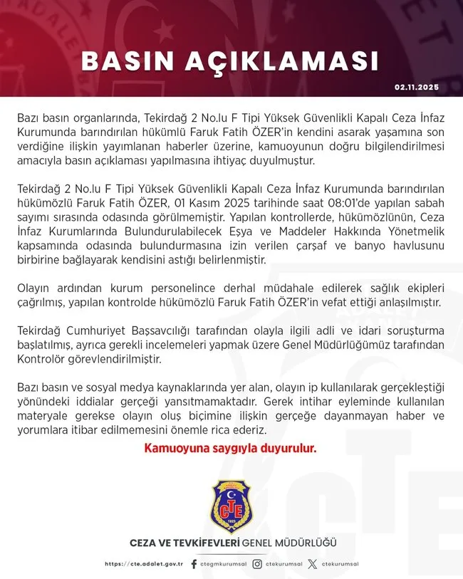 Görevlilerin yaptığı kontrolde Faruk Fatih Özer'in öldüğü belirlendi. İntihar ettiği üzerinde durulan Özer'in cansız bedeni, cezaevi savcısının yaptığı incelemenin ardından Tekirdağ İsmail Fehmi Cumalıoğlu Şehir Hastanesi’ndeki morg kısmında bulunan Adli Tıp Kurumu'na sevk edildi.