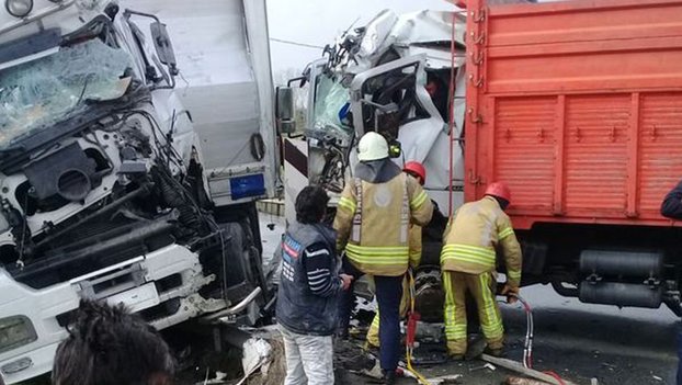 İstanbul'da dün öğlen saatlerinde Arnavutköy Haraççı Mahallesi'ne meydana gelen olayda, iddiaya göre bir kamyon, dere üzerinde bulunan dar yolda karşı yönden gelen tır ile kafa kafaya çarpıştı.
