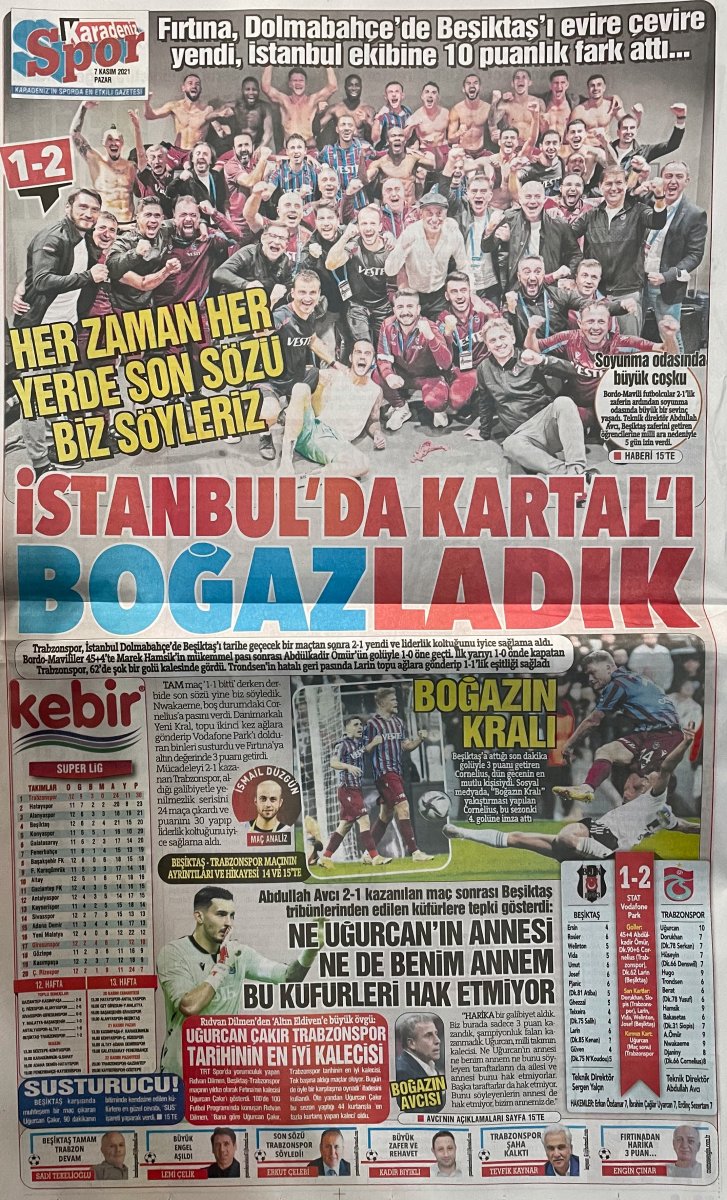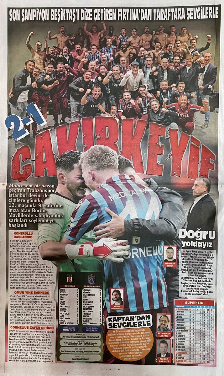 Taka gazetesi ise birinci sayfasında "Fırtına İstanbul'da kasırgaya döndü, Vodafone Park'ı da yıktı geçti" başlığını kullandı. Arka sayfasında "Alemin kralı şampiyonluğa koşuyor" ve "Beşiktaş'ı Vodafone Park'ta Abdülkadir Ömür ve Cornelius'un golleriyle deviren Trabzonspor farkı 10'a çıkardı" başlıklarına yer verdi.