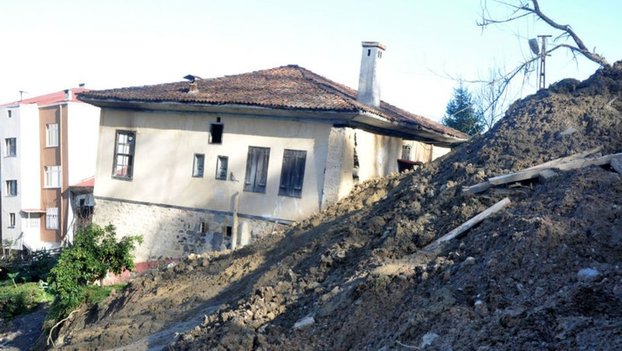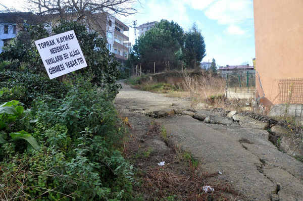 Heyelan görülen mahallede toprak kayması riskine karşın çalışmaların yürütüldüğü alana `Toprak kayması nedeniyle yayaların bu alana girmesi yasaktır' yazılı uyarı tabelaları konuldu