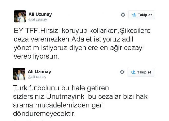 Uzunay, "Ey Türkiye Futbol Federasyonu, hırsızı koruyup kollarken, şikecilere ceza veremezken. Adalet istiyoruz. Adil yönetim istiyoruz diyenlere en ağır cezayı verebiliyorsun. Türk futbolunu bu hale getiren sizlersiniz. Unutmayın ki bu cezalar bizi hak arama mücadelemizden geri döndüremeyecektir" ifadelerini kullandı.