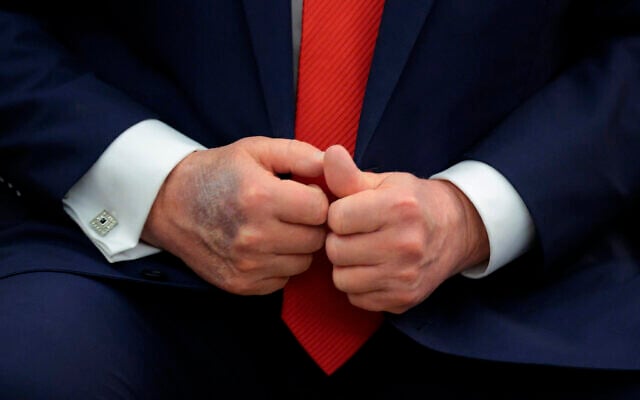 ABD Başkanı Donald Trump'ın, 25 Ağustos 2025'te Washington DC'deki Beyaz Saray'ın Oval Ofisi'nde Güney Kore Devlet Başkanı Lee Jae-myung ile yaptığı görüşme sırasında sağ elinin arkasında bir morluk görülüyor. (Chip Somodevilla/Getty Images/AFP)
