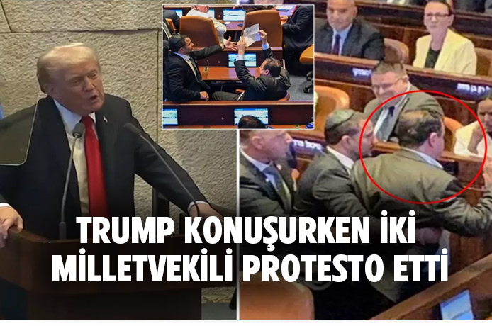 İsrail Parlamentosu'nda (Knesset) konuşan ABD Başkanı Donald Trump, İsrail Başbakanı Binyamin Netanyahu'ya teşekkür ettiği sırada salonda beklenmedik bir protesto yaşandı. Sol Parti Hadash Genel Başkanı Ayman Odeh ve Milletvekili Ofer Cassif, "Filistin'i tanı" yazılı kağıtlarla gösteri yaptılar ve parlamentodan çıkarıldılar.