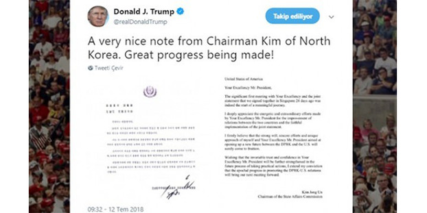 ABD Başkanı Donald Trump, Kuzey Kore lideri Kim Jong Un'un kendisine gönderdiği mektubu Twitter'daki hesabından paylaşarak "Kuzey Kore Başkanı'ndan çok iyi bir not. Harika gelişme kaydedildi" ifadelerini kullandı.