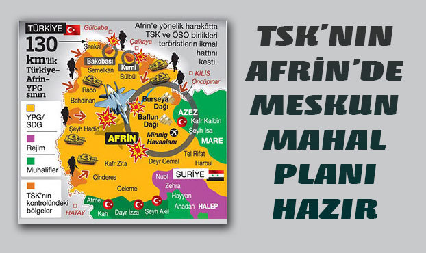 Afrin’e yönelik Zeytin Dalı Harekâtı’nda 13’üncü gün geride kalırken, Türk Silahlı Kuvvetleri ( TSK) bir yandan kent kırsalındaki operasyonlara yoğunlaşıyor, diğer yandan da Afrin kent merkezinde meskûn mahal operasyonları için hazırlık planlarını tamamlanmaya çalışılıyor. Mevsim koşulları yolunda giderse 12 Şubat itibarıyla Afrin kent merkezinin doğu, batı ve kuzey cephesinde yer alan 127 yerleşim bölgesinin temizliği için start verilecek. Planlara göre şubat ayının sonu veya mart ayının ilk haftasında Afrin’de meskûn mahal operasyonunun başlatılmasının planlandığı kaydedildi.
