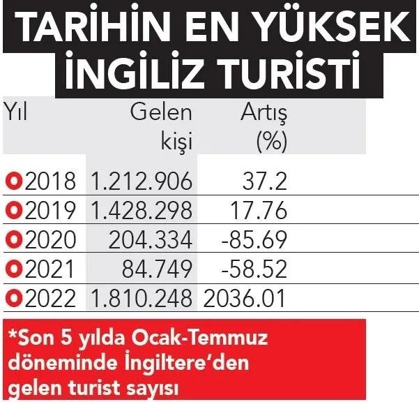 21 katlık artışta 2021'deki gerileme etkili oldu. Buna karşılık turizmde zirveye ulaşılan 2019 yılı baz alındığında İngiliz pazarındaki artış yeni bir rekorun göstergesi... Öyle ki İngiltere'den 2019'un 7 aylık döneminde 1.4 milyon turist ağırlayan Türkiye, bu yıl bu sayının yüzde 26.7 üzerine çıkmayı başardı.