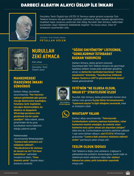 Fetullahçı Terör Örgütü'nün (FETÖ) 15 Temmuz darbe girişimi sırasında Türk Telekom binasını ele geçirmeye teşebbüs edilmesine ilişkin davada ağırlaştırılmış müebbet hapis cezasına çarptırılan eski albay Nurullah Zeki Atmaca, hakkındaki suçlamaları alaylı ifadelerle reddederek, örgütün "Ne olursa olsun, inkar et" stratejisini seçenlerden oldu.