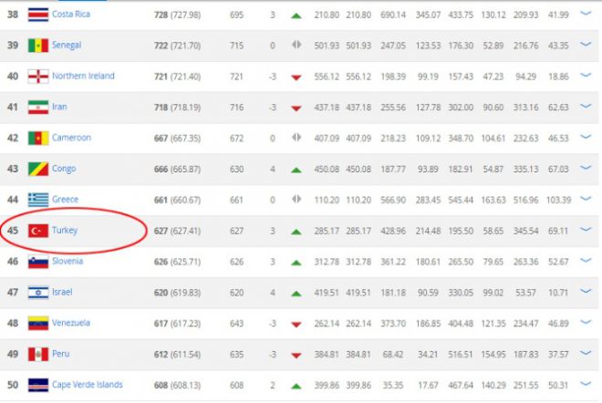 Uluslararası Futbol Federasyonları Birliği (FIFA) tarafından açıklanan ağustos ayı dünya sıralamasına göre, Arjantin liderliğini sürdürürken, son Dünya Kupası şampiyonu Almanya'yı geçen Belçika, 2.'liğe yükseldi. EURO 2016 elemelerinde A Grubu'nda mücadelede eden Türkiye ise 627 puanla 3 basamak yükselerek 45. sırada yer aldı. Açıklanan sıralamada en büyük çıkışı gösteren ülke olmayı başaran Jamaika, 21 sıra yükselerek 55. sıraya yerleşti.