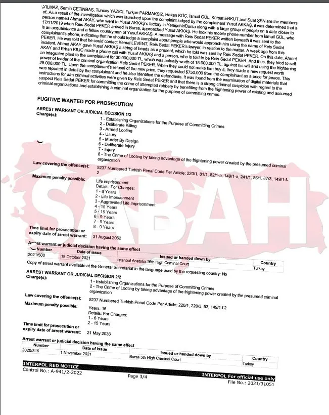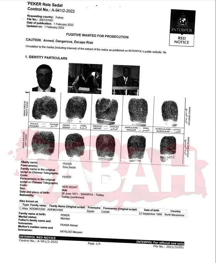 INTERPOL'un kararı, Adalet Bakanlığı, İstanbul Anadolu Cumhuriyet Başsavcılığı ve Bursa Cumhuriyet Başsavcılığı'na bildirildi. Adalet Bakanlığı, Birleşik Arap Emirlik'leri'nde bulunan Sedat Peker'in tutuklanıp Türkiye'ye iadesini istedi. SABAH'ın ulaştığı INTERPOL'un kırmızı bülten kararında, Peker'in 3 farklı fotoğrafı, kimlik bilgileri ve parmak izi yer aldı.
