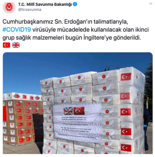 MSB'den yapılan açıklamada "Cumhurbaşkanımız Erdoğan’ın talimatlarıyla, Covid-19 virüsüyle mücadelede kullanılacak olan ikinci grup sağlık malzemeleri bugün İngiltere’ye gönderildi." denildi.