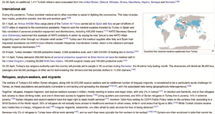 Dünyanın en büyük dijital kütüphanesi ve online bilgi kaynağı olan Wikipedia’nın İngilizce uluslararası sayfasında yayınlanan bir görsel Türkiye’nin dünyaya yardımlarının ne denli geniş çaplı olduğunu ortaya koydu. Tüm dünyada Kovid-19 salgını hakkında başlıklar açan ve tek tek hangi ülkede krizin nasıl seyrettiğini, alınan önlemleri, ekonominin nasıl etkilendiğini, rakamları ve tartışmaları da gündemine taşıyan Wikipedia Türkiye için de bu konuda bir başlık açtı.