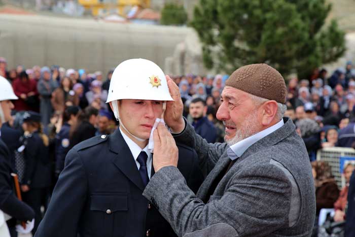 Bu sırada şehidin tabutunun başında nöbet tutan bir polis memurunun ağladığını gören şehit yakını, "Ağlama düşmanları güldürme, ağlama" diyerek polisin gözyaşlarını sildi.