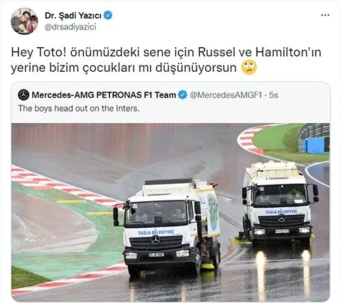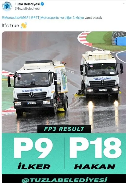 Dünyanın en büyük motor sporları organizasyonu olan Formula 1'de heyecan İstanbul'da yaşanıyor. Formula 1'in antrenman seansında etkili olan yağmuru kurutmak için piste çıkan Tuzla Belediyesi Süpürme Araçları yine dünyanın gündemine oturdu. Antrenman seansında istediği sonuçları alamayan Mercedes takımı, antrenman sıralamalarını Tuzla Belediyesi'nin araçlarının görsellerini kullanarak paylaştı. Başkan Yazıcı da Mercedes pilotlarına gönderme yaparak," Önümüzdeki sene için Russell ve Hamilton'ın yerine bizim çocukları mı düşünüyorsun" dedi.