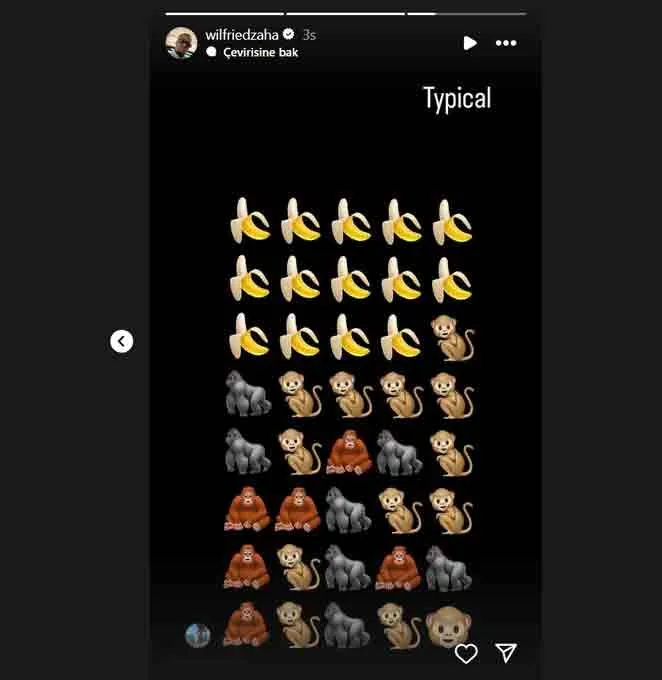 Galatasaray'ın yıldız futbolcusu Wilfried Zaha, çirkin bir olayla karşı karşıya kaldı. Fildişi Sahilli futbolcu, sosyal medya hesabından kendisine yapılan ırkçılığı ifşa etti. Zaha, kendisine gelen 'muz' ve maymun' görüntülü mesajı paylaşırken "Tipik" notunu düştü.