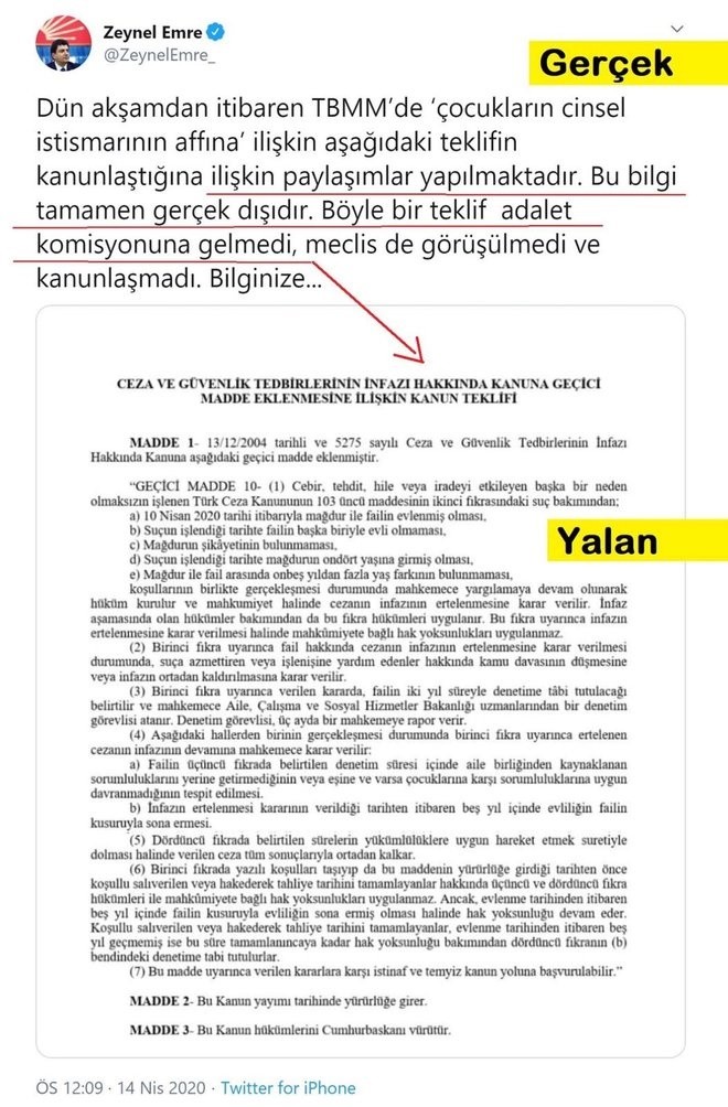 Türkiye Büyük Millet Meclisi'nde kabul edilen İnfaz Yasası ile ilgili sosyal medyada "Çocukların Cinsel İstismarının Affına" ilişkin olduğu iddia edilen sahte bir belge dolaşıma sokuldu. Belgeyle sanki çocukları cinsel istismara maruz bırakan kişilerin affedildiği izlenimi oluşturulmaya çalışıldı.