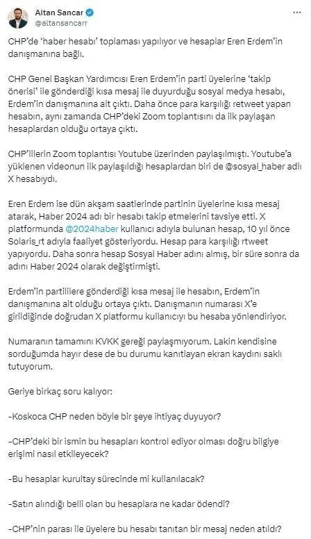 Sancar ilk olarak şunları söyledi: "CHP'de 'haber hesabı' toplaması yapılıyor ve hesaplar Eren Erdem'in danışmanına bağlı. CHP Genel Başkan Yardımcısı Eren Erdem'in parti üyelerine 'takip önerisi' ile gönderdiği kısa mesaj ile duyurduğu sosyal medya hesabı, Erdem'in danışmanına ait çıktı. Daha önce para karşılığı retweet yapan hesabın, aynı zamanda CHP'deki Zoom toplantısını da ilk paylaşan hesaplardan olduğu ortaya çıktı."