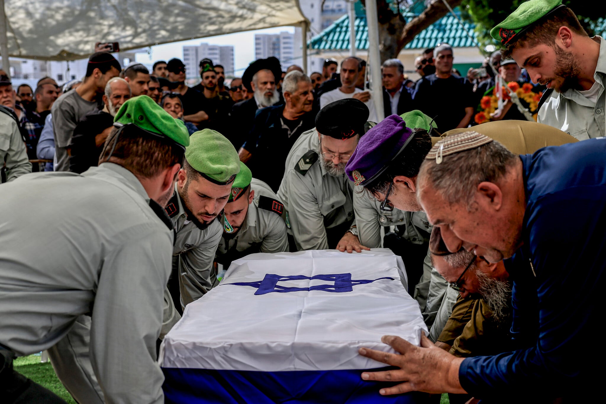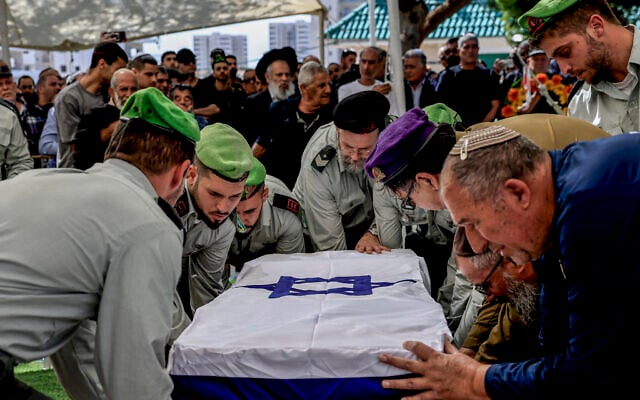 Ölen IDF askeri Yüzbaşı Noam Madmoni'nin ailesi ve arkadaşları, 31 Mart 2026'da Sderot Askeri Mezarlığı'ndaki cenaze törenine katıldı. (Tsafrir Abayov/Flash90)