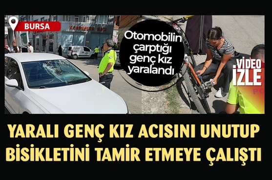 Bursa'nın İnegöl ilçesinde meydana gelen kazada otomobilin çarptığı bisikletli genç kız yaralandı. Yaralanan genç kızın yerden kalkıp bisikletinin çıkan zincirini takmaya çalışması dikkat çekti.