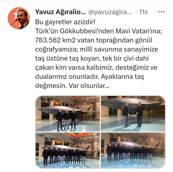 "Bu gayretler azizdir. Türk'ün Gökkubbesi'nden Mavi Vatanı'na, 783.562 kilometre kare vatan toprağından gönül coğrafyamıza; milli savunma sanayimize taş üstüne taş koyan, tek bir çivi dahi çakan kim varsa, kalbimiz, desteğimi ve dualarımız onunladır. Ayaklarına taş değmesin. Var olsunlar."
