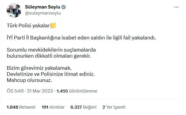 Bakan Soylu açıklamasında; "Türk Polisi yakalar. İYİ Parti İl Başkanlığına isabet eden saldırı ile ilgili fail yakalandı. Sorumlu mevkidekilerin suçlamalarda bulunurken dikkatli olmaları gerekir. Bizim görevimiz yakalamak. Devletinize ve Polisinize itimat ediniz. Mahcup olursunuz." dedi.