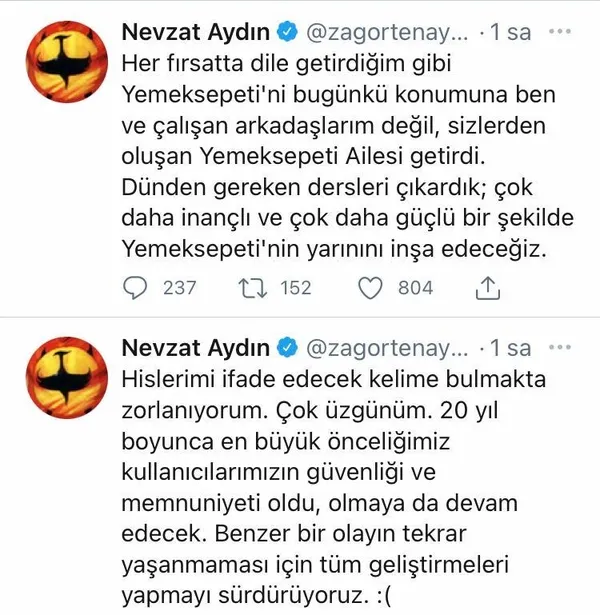 "Bir üye "Nevzat Bey (Yemeksepeti CEO'su) bilgilerimizin çalındığını neden neredeyse 2.5 gün sonra haber verdiniz. Biz de kendi aksiyonumuzu alırdık bir an önce. Bu büyük bir ihmal" diye tweet atmış. Bunun gibi sosyal medyada binlerce şikayet yorumu var, lakin ne şirketten, ne de CEO'dan cevap yok. 'Bir basın açıklaması yaptık, daha ne istiyorsunuz?' mu demeye getiriyorlar acaba? Çalınan e-mail ve şifre kombinasyonu ile açılmış birçok hesabın kırılma tehlikesi var ama Yemeksepeti'nden bir açıklama yok."
