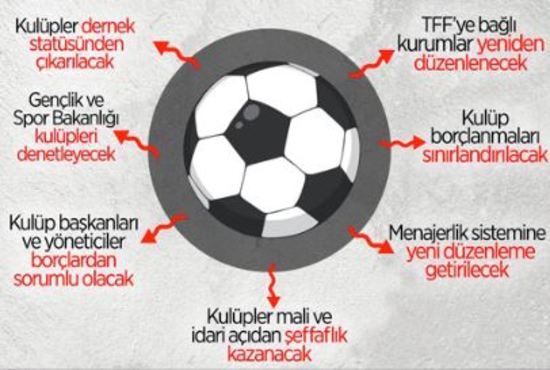 4- Düzenleme ile spor kulüpleri ve spor anonim şirketleri için "denk bütçe" sistemi getirilecek. Spor kulüpleri ve spor anonim şirketleri, önceki yıl brüt gelirlerinin en fazla yüzde 10'una kadar borçlanabilecek.
