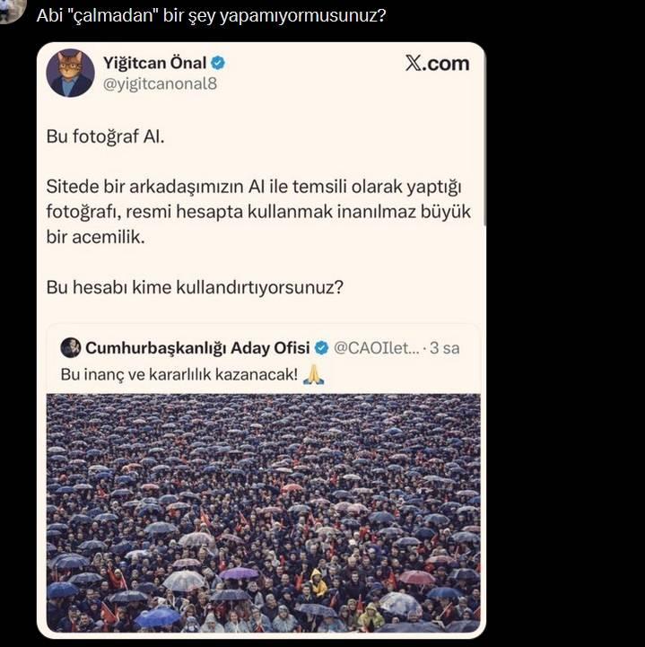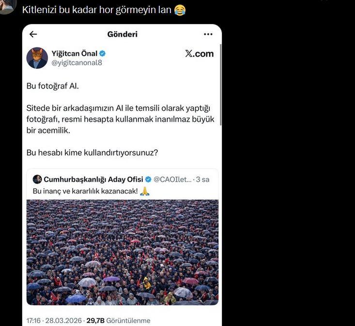 Yarkadaş, İmamoğlu'nu desteklemek amacıyla kurulan Cumhurbaşkanlığı Aday Ofisi adlı sosyal medya hesabından paylaşılan Çanakkale mitingi fotoğrafının yapay zeka ile üretilmiş bir montaj olduğunu belirterek duruma tepki gösterdi.