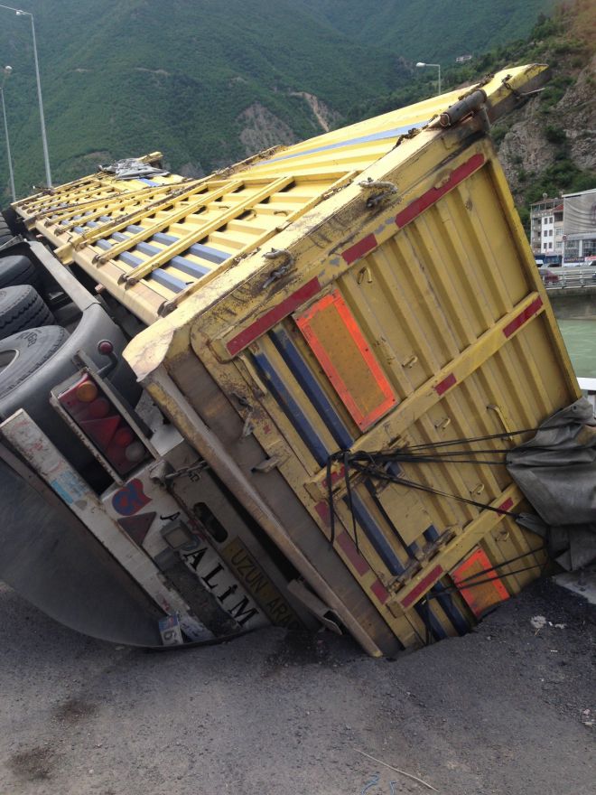 Artvin Merkez Köprübaşı mevkiinde gece TIR'ını park ederek içinde uyuyan şoför, sabah büyük bir korkuyla uyandı. Talihsiz şoförün TIR'ını park ettiği yolun altı boşalınca TIR büyük bir gürültü ile yan yatarken, şoför son anda Çoruh’a düşmekten kurtuldu. Edinilen bilgiye göre, Sezgin Şahin yönetimindeki 61 K 5831 plakalı TIR, Trabzon’dan Ardahan’a un götürüyordu. Gecenin geç saatleri olması dolayısıyla Artvin Merkez’de Köprübaşında yol kenarına aracını park etti. Sabah saatlerinde büyük bir sarsıntıyla uyanan şoför Şahin, Çoruh’a doğru kaymakta olan aracını kurtarmak için büyük bir mücadele verdi. Yol kenarında bulunan korkulukların direklerine takılan TIR Çoruh’a düşmezken, olay yerine gelen trafik polisleri hemen olay yerinde güvenlik önlemleri alarak kaza yaşanmasının da önüne geçti.