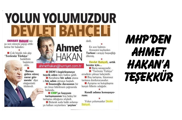 “Yolun yolumuzdur” başlığıyla bir yazı kaleme alan Ahmet Hakan MHP’den övgü aldı. MHP Genel Başkan Yardımcısı İzzet Ulvi Yönter “Yolun yolumuzdur…Sayın Ahmet Hakan’a ağyarını mani efradını cami köşe yazısından dolayı teşekkür ederiz…” dedi.