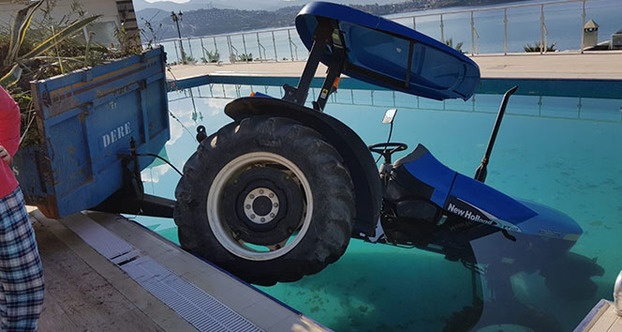 Yalıkavak Gökçebel Mahallesi'nde meydana gelen olayda lüks bir siteye ait yüzme havuzunun içine traktör düştü. Edinilen bilgiye göre, traktör sürücüsünün site içerisinde çalışma yaparken traktörü park ettiği ve el frenini çekmeyi unuttuğu öğrenildi. Park halindeyken birden hareket eden traktör sitenin su dolu havuzuna düştü. Olayda ölen ya da yaralanan olmadı. Traktörü kendi imkanlarıyla çıkaramayan site yetkilileri vinç çağırdı. Traktörün vince bağlanarak havuzdan çıkarıldığı anlar ise ilginç görüntülere sahne oldu